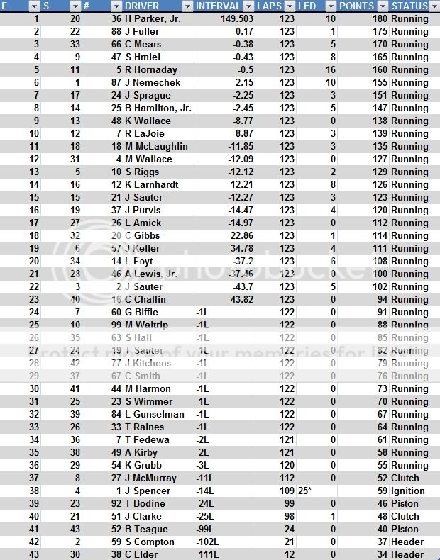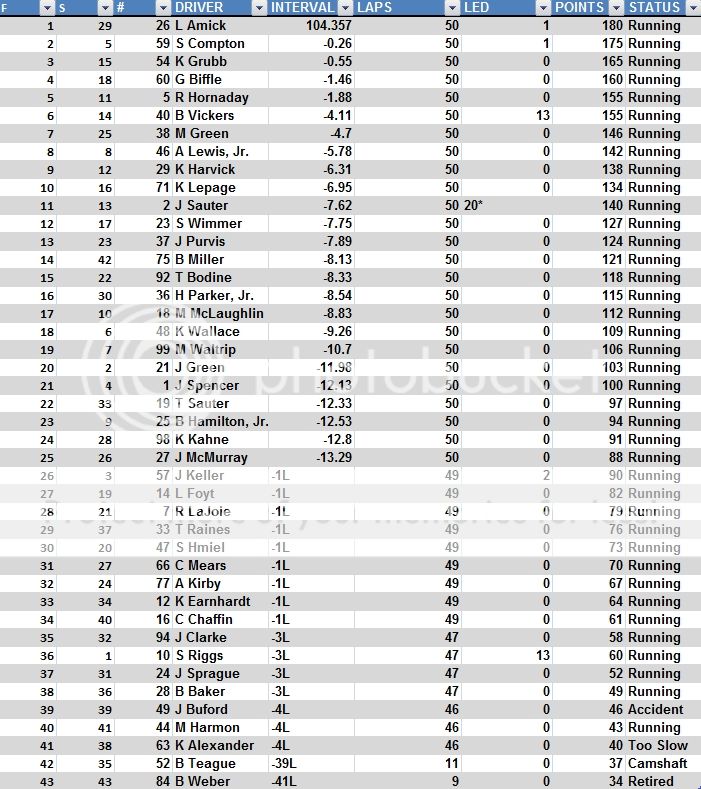 The season has had 7 different winners for 7 different races. The season opener found Scott Riggs taking his first win in his first start at Daytona, leading only 1 lap. Jack Sprague lead the most laps with 6, but wound up 5th. Dale Earnhardt, Jr. held station and finished where he started, 4th. Jordan Clarke Finished 22 in his debut. (That's me!!!)