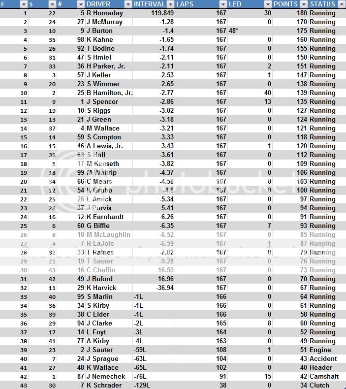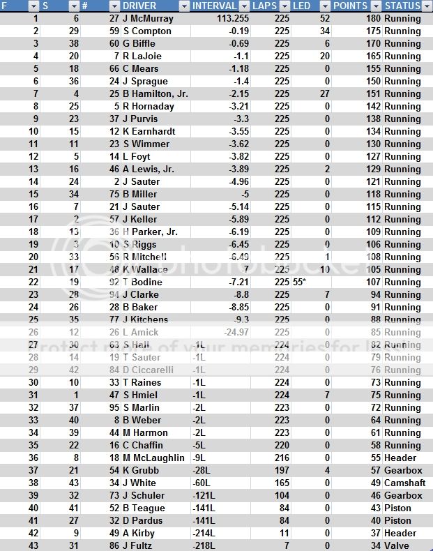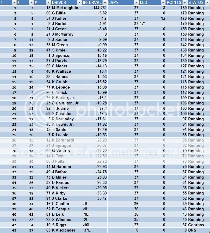 26 23 60 G Biffle -24.93 20 0 85 Running