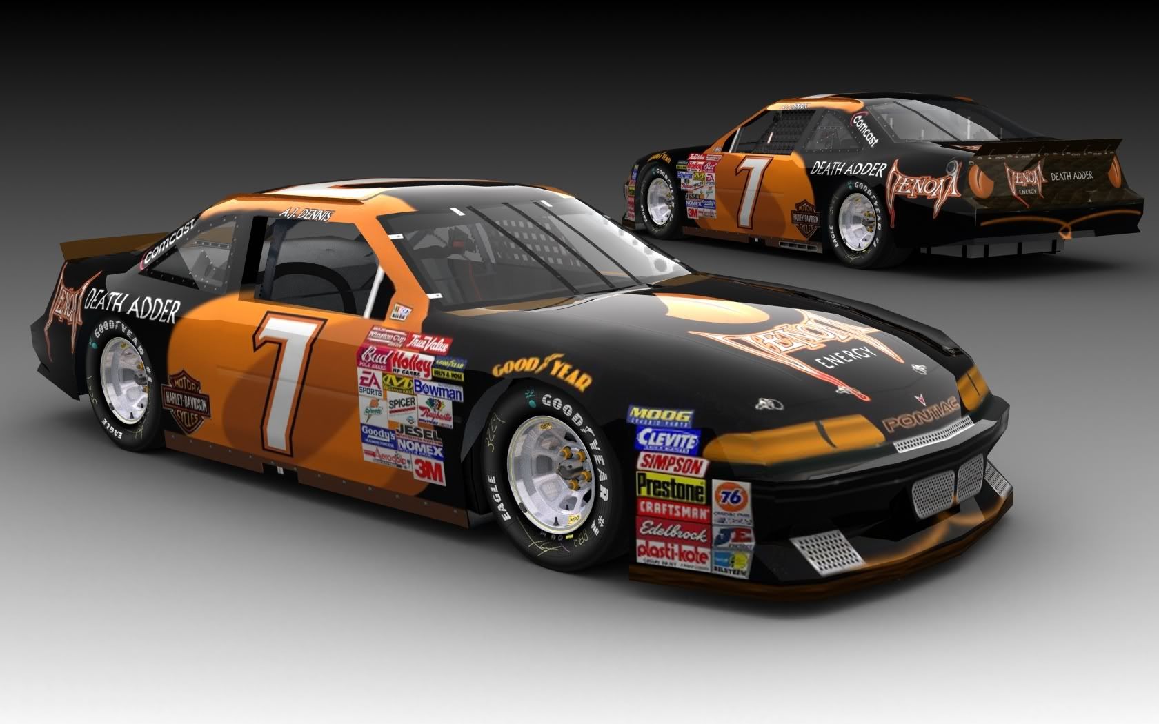 I can't remember where I got the venom logo, though I made the 'Death Adder' part myself, along with the base and number. The Comcast logo I believe is Deadpool's, and the Harley logo from Lurn2Burn, all on Scott Womack's template. The subtle snakeskin on the rear is from a google image search, colorized by me to fit the scheme.